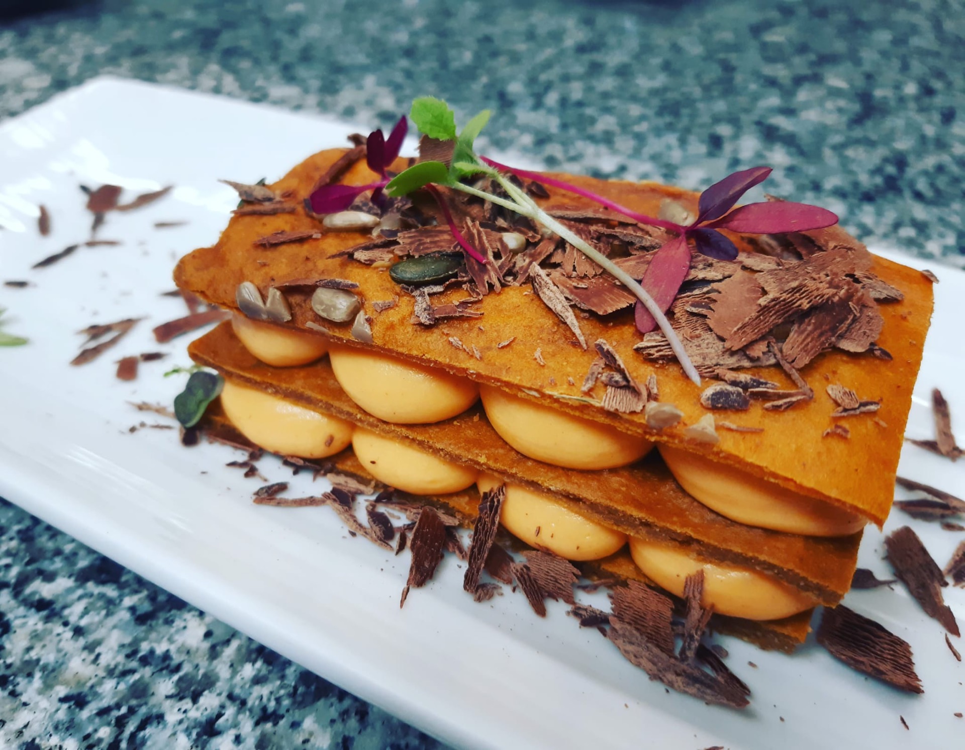 Trituramos los dátiles, la otra parte de la batata y le añadimos el queso crema.Lo ponemos en una manga pastelera y lo montamos.